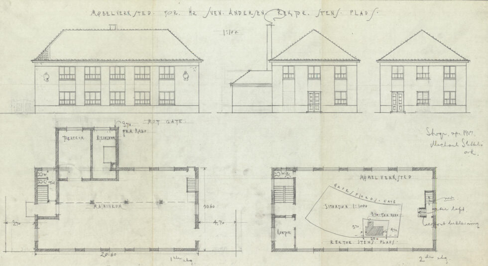 Rektor Steens plass 1, dagens Uldals videregående skole, ble tegnet av Michael Slettebø som møbelverksted for Sven Andersen og stod ferdig oppført i 1919.