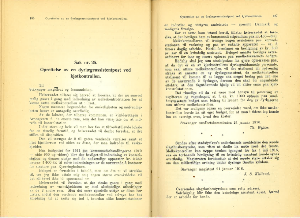 I tiden før 1910 fungerte slaktekyndig assistent som medhjelper ved kjøttkontrollen. Da tilleggsloven av 25. juni 1910 bestemte at kjøttkontrolløren skulle være dyrlege, ble dyrlege Selmer ansatt som assistent ved kjøttkontrollen og sunnhetsvesenet – med 4 timer daglig ved kjøttkontrollen (216/1922, 25/1916).